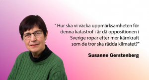 ”Det finns råd för demonstrationsvilliga kärnkraftsmotståndare från World Information Service on Energy (WISE) i Nederländerna: en person ställer sig över dagen med en flagga med budskapet ”Don’t Nuke the Climate” på stadens torg, en ensamdemonstrant flankerad av medföljare på avstånd som delar ut flygblad om att kärnkraften sabbar klimatet. Välkommen den 26 april på Mynttorget i Stockholm till exempel.” Det skriver Susanne Gerstenberg, styrelseledamot i Folkkampanjen, i artikeln Minns Tjernobyl – kärnkraften räddar inte klimatet.