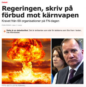 ”FN har antagit en konvention som förbjuder anskaffning, tillverkning och användning av kärnvapen. Nu återstår tre stater till de 50 som måste skriva under för att förbudet ska träda i kraft. Sverige deltog i arbetet för konventionen i FN men vill nu, efter påstötning från USA, inte underteckna den.”