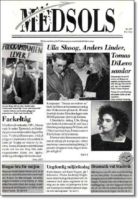 Medsols nr 1 / 1992 läs bl a om: - fackeltåg i Hudiksvall - ungdomlig miljöriksdag - forum för miljö och utveckling - Anders Linder o Ulla Skog samlade namn - välkomna till kongress i Alingsås - Studsvik lägger ner forskning