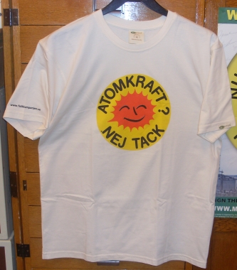 Folkkampanjens klassiska soltröjor: ”ATOMKRAFT? NEJ TACK”; |