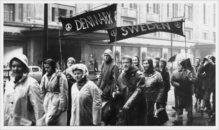 ![]() Dom svenska deltagarna vid marchen från Aldermaston till London |