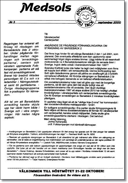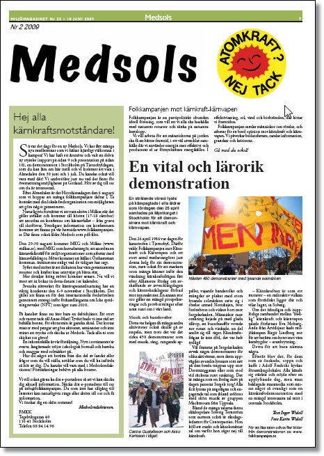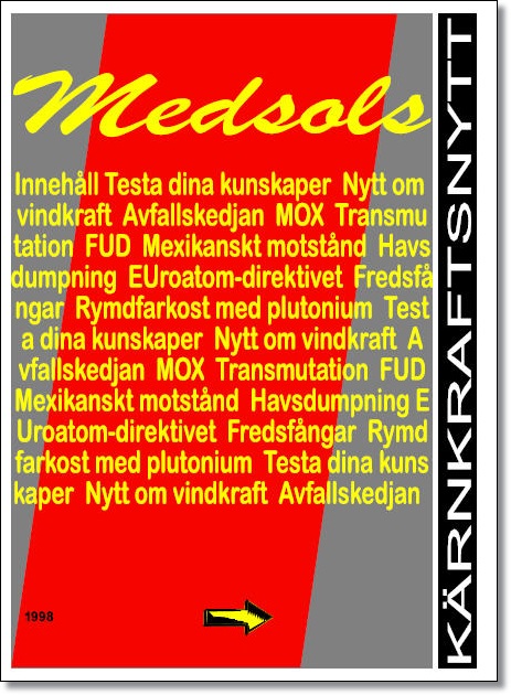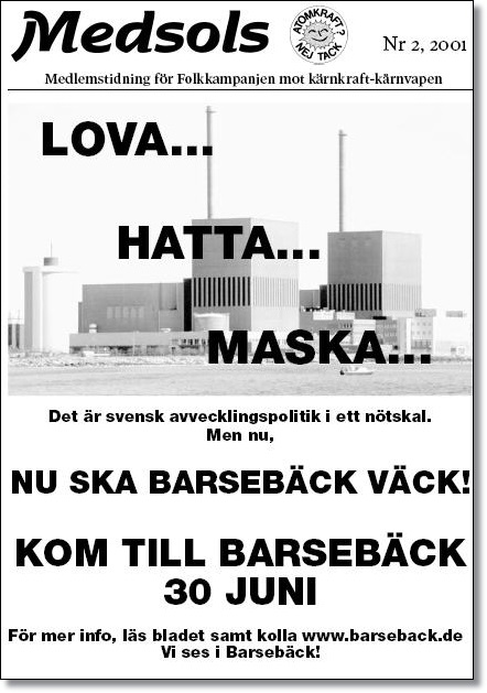 Medsols nr 2 / 2001 (jun 2001) läs bl a om: - nu ska Barsebäck väck - MOX i Oskarshamn - Sellafield – ett kapitel för sig - vem bestämmer avvecklingen, folket /bolagen? |
