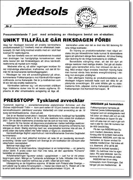 Medsols nr 2 / 2000 (juni 2000) läs bl a om: - presstopp Tyskland avvecklar - verksamhetsplan för 2000 - folkomröstningen 20 år efteråt - Ulla Lindströms minnesfond |