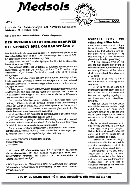 Medsols nr 4 / 2000 (dec 2000) läs bl a om: - regeringen bedriver ett cyniskt spel - svenskt löfte om stängning håller ej - Lars Nordström till minne - tunnor med atomavfall vittrar sönder |