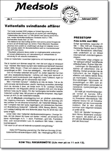 Medsols nr 1 / 2001 (feb 2001) läs bl a om: - Vattenfalls svindlande affärer - uranammunitionen drabbar civila - kräv förbud mot uran-ammunition - full möjligt att avveckla |