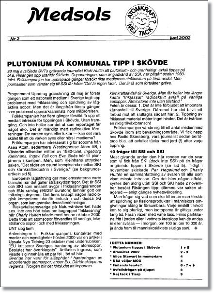 Medsols nr 2 / 2002 (jun 2002) läs bl a om: - plutonium på kommunal soptipp i Skövde - verksamhetsplan 2002/2003 - medlemsvärvning - Alice Steward död - sommarläger 2002 |