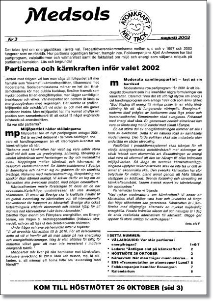Medsols nr 3 / 2002 (aug 2002) läs bl a om: - partierna inför valet 2002 - Barsebäcksoffensiv - atomaktion - höstmöte Solhuset - kalendarium 2002 |