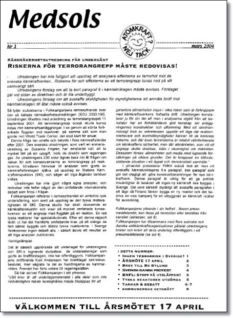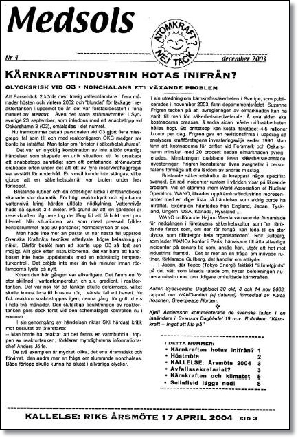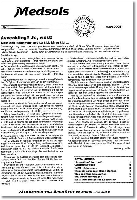 Medsols nr 1 / 2003 (mar 2003) läs bl a om: - avveckling, ja visst.... - Riksårsmötet 2003 - riv upp Euroatom-avtalet - kalendarium 2003 - MOX-bränsle får användas i Oskarshamn |