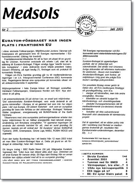 Medsols nr 2 / 2003 (jul 2003) läs bl a om: - Euroatom-avtalet har ingen plats i Europa - folkkampanjens ordf: aldrig ger vi upp - Riksårsmötet 2003 - minns du tusenlapps-lånet? - värmepumpar i kritisk belysning |