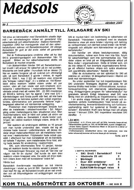 Medsols nr 3 / 2003 (okt 2003) läs bl a om: - Barsebäck anmält till åklagaren av SKI - höstmöte i Solhuset 25 okt - mörklagt, varför har vi så många strömavbrott - över 300 enkätsvar - storskaligheten kärnkraftens akilleshäl |