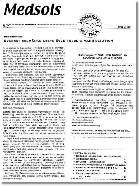 Medsols nr 2 / 2004 (jun 2004) läs bl a om: - solmärket lyste över demonstration i Finland - vad betyder EU:s utvidgning för kampen? - sätt P för stödet till bankrupp teknik - hemligt iranskt kärnvapenprogram |