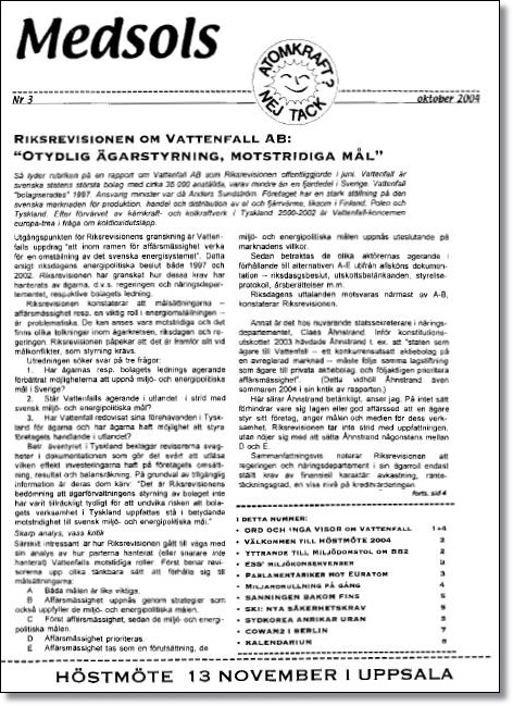 Medsols nr 3 / 2004 (okt 2004) läs bl a om: - otydlig ägarstyrning i Vattenfall - höstmöte 14 okt i Uppsala? - ESS:s miljökonsekvenser måste utredas - miljardrullning till teknik utan framtid - sanningen bakom den finska reaktorn |