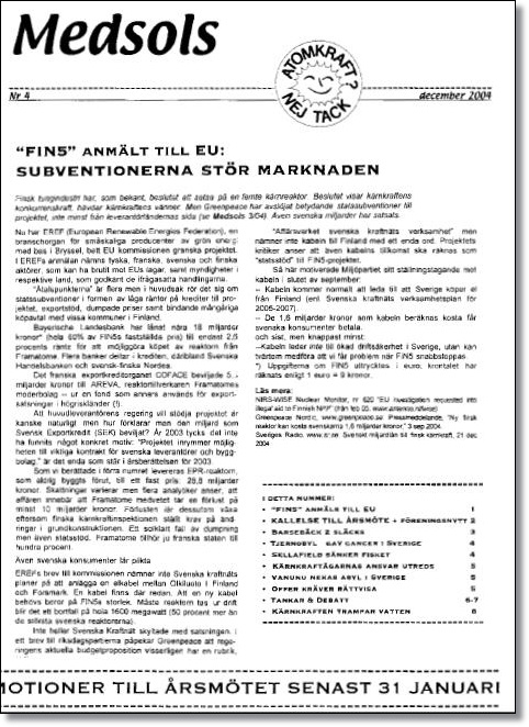 Medsols nr 4 / 2004 (dec 2004) läs bl a om: - 'FIN5' anmält till EU - kallelse till Riksårsmöte 2005 i Solhuset - IAEA synar Brasilien - Tjernobyl bakom 500 cancerfall i Sverige - kärnkraftsägarnas ansvar utreds |