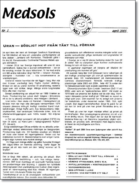 Medsols nr 1 / 2004 (apr 2005) läs bl a om: - uran dödligt hot - Riksårsmöte 2005 i Solhuset - vetenskapsmagasinet, SvT, tar parti - Tjernobyl bakom 500 cancerfall i Sverige |