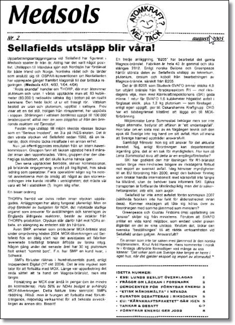 Medsols nr 2 / 2005 (aug 2005) läs bl a om: - Sellafields utsläpp blir våra - förnybar energi framtidens jobbmaskin - ESS-plan fick grönt ljus av KF - Bushs kärnavfallsprogram en härdsmälta |