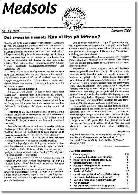 Medsols nr 3-4 / 2005 (feb 2006) läs bl a om: - det svenska uranet, kan vi lita på löftena - extra årsmöte i Stockholm - vi minns Malin Dahlgren - vännerna i Finland - Östersjön lagrar minnena från Tjernobyl - seminarium i Wien |