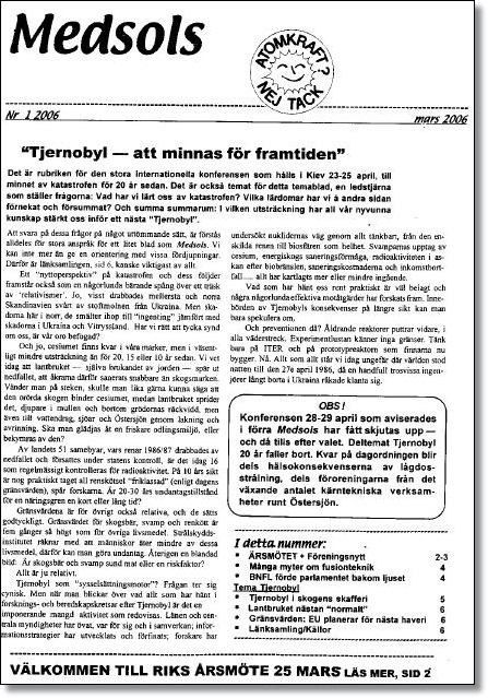 Medsols nr 1 / 2006 (mar 2006) läs bl a om: - Tjernobyl att minnas för framtiden - välkommen till Riksårsmötet 2006 - Tjernobyl 20 år 20 liv - många myter om fusion - Tjernobyl i skogens skafferi - verksamhetsberättelse 2005 |