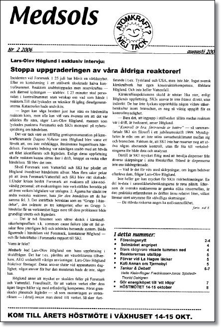 Medsols nr 2 / 2006 (aug 2006) läs bl a om: - stoppa uppgraderingen av våra reaktorer - Folkkampanjen i Almedalen - föreningens årsstämma - internationell konferens om Östersjön - Solmärket angripet från flera håll - avstå från svenska urangruvor |