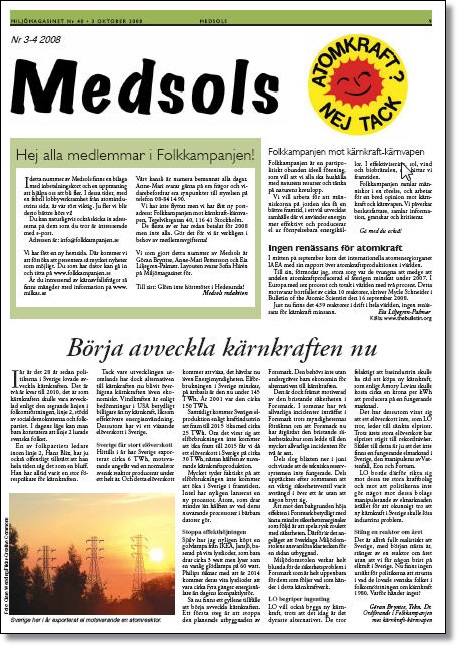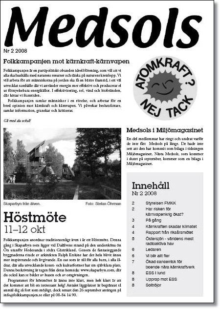Medsols nr 2 / 2008 (juli 2008) läs bl a om: - höstmöte 11-12 oktober - har risken för kärnvapenkrig ökat? - kärnkraften skadar klimatet - Rapport från Riksårsmötet - Kärnkraften är livsfarlig, dyr och onödig - ESS i Lund |